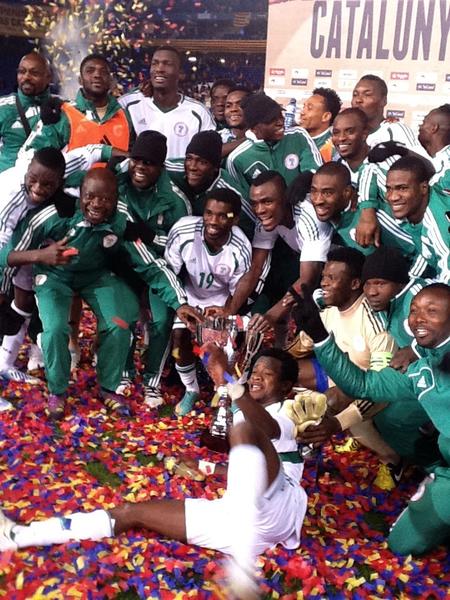 After winning the Catalan Cup last night in Spain many will agree with me that the year 2013 has started on a very bright note for the Eagles. Although it might not be the Cup millions of fans around the nation are craving for but holding a star studded team with the likes of Xabi Hernandez, Gerrad Pique, Bojan, Tello, Puyol and a host of other Spanish league stars is something we should be proud of. A Sergio Gonzalez converted spot kick early in the 7th minute gave the hosts the lead before US-based striker Bright Dike got the Super Eagles an equaliser in the 55th minute. Nigeria won Catalan trophy on Away goal rule. Hugo Alvares,one of d organizers of the tie says "As the away team their goal counted double"